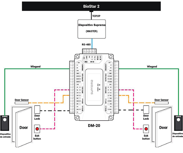 DM-20 proporciona control de acceso seguro de hasta dos puertas vía comunicación encriptada y también contiene dos interfaces de lector para uso con lectores de terceros (Wiegand). Una amplia variedad de interfaces E/S permite a DM-20 ser parte de diversas configuraciones de sistema.