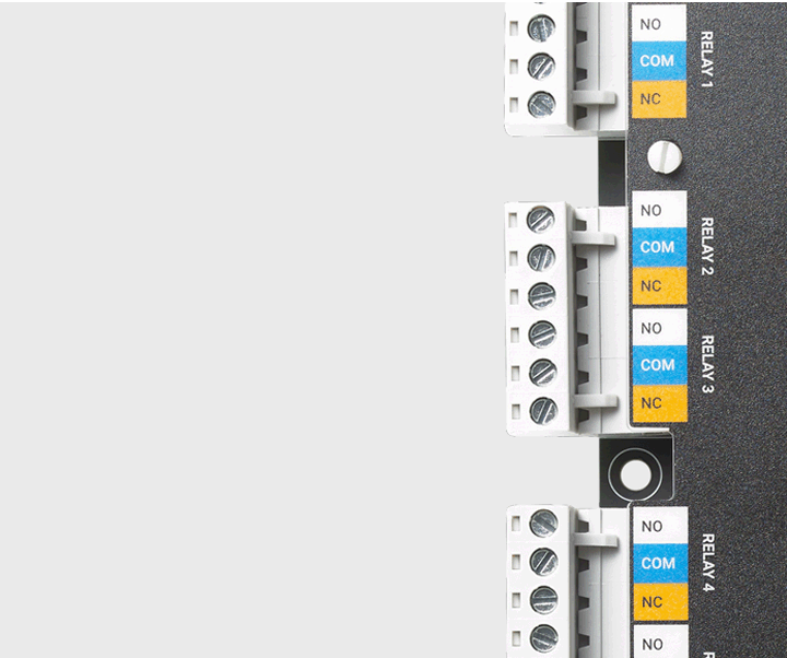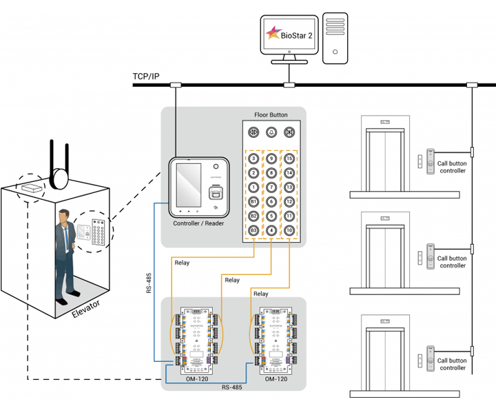 OM-120 es un módulo de extensión de salida múltiple que controla hasta 12 relés de salida. Se puede utilizar como controlador de ascensor con el sistema BioStar 2. Max. 31 unidades se pueden conectar a un dispositivo maestro a través de RS485. OM-120 también puede soportar características de zona anti-pasback y zonas de alarma de incendio.
