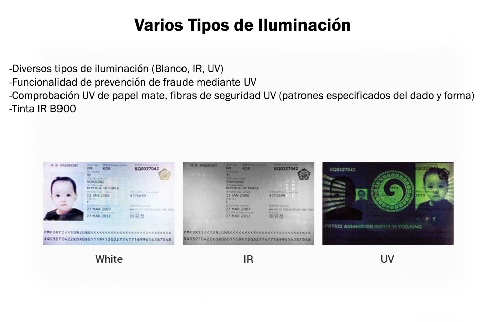 | Función de reconocimiento automático de documentos (pasaporte, tarjeta de identidad, Visa, tarjeta de contacto/sin contacto, etc.) |